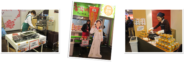 さらに入り口近くでは、その場で焼いた韓国ノリを試食販売しているほか、キムチ、カルビ、サムギョプサル、黒酢、生マッコリなどの試食・試飲ができます。